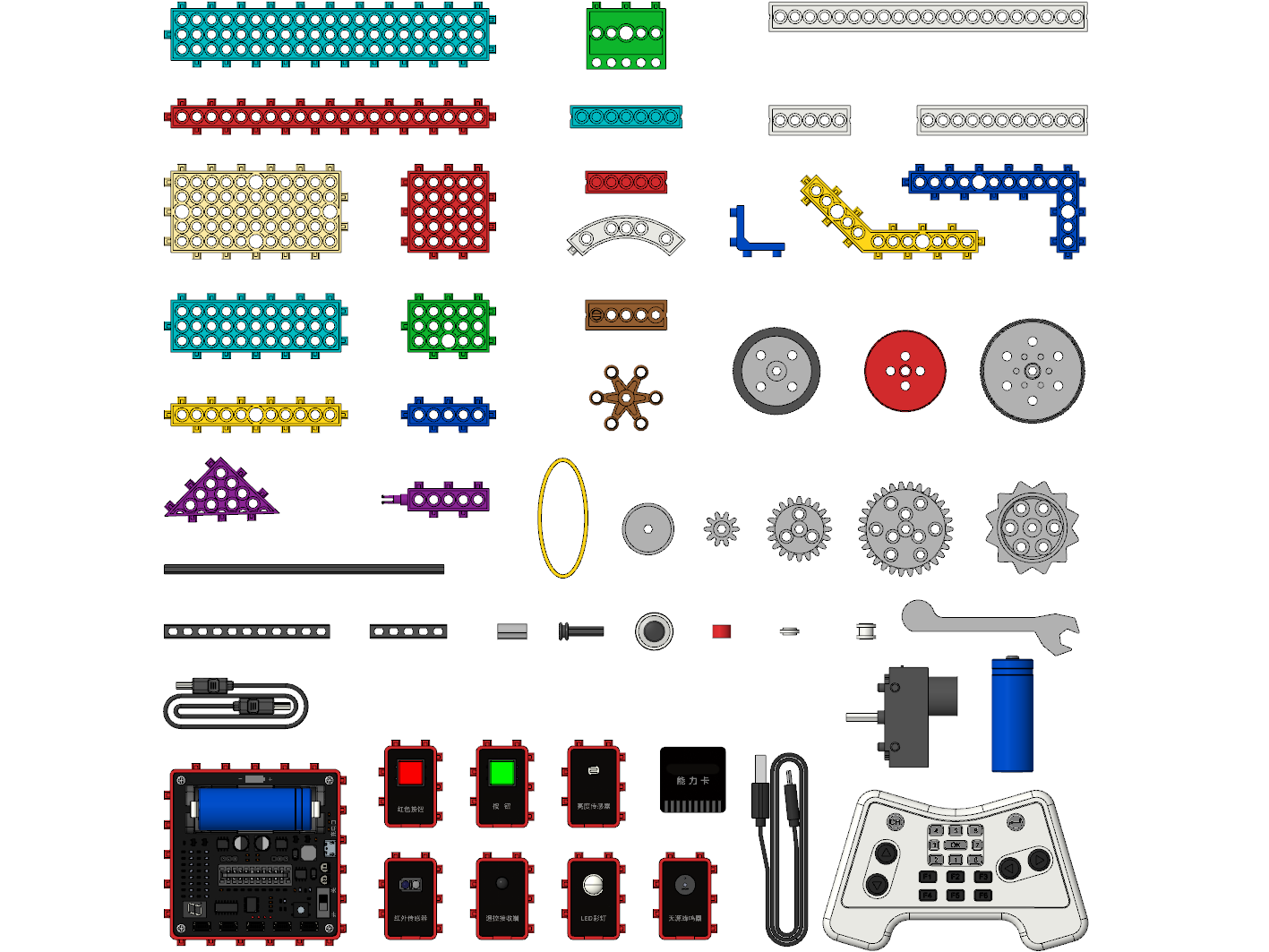 器材内容物包含:积木模块类、传感器类、执行器类、控制器类及电源类